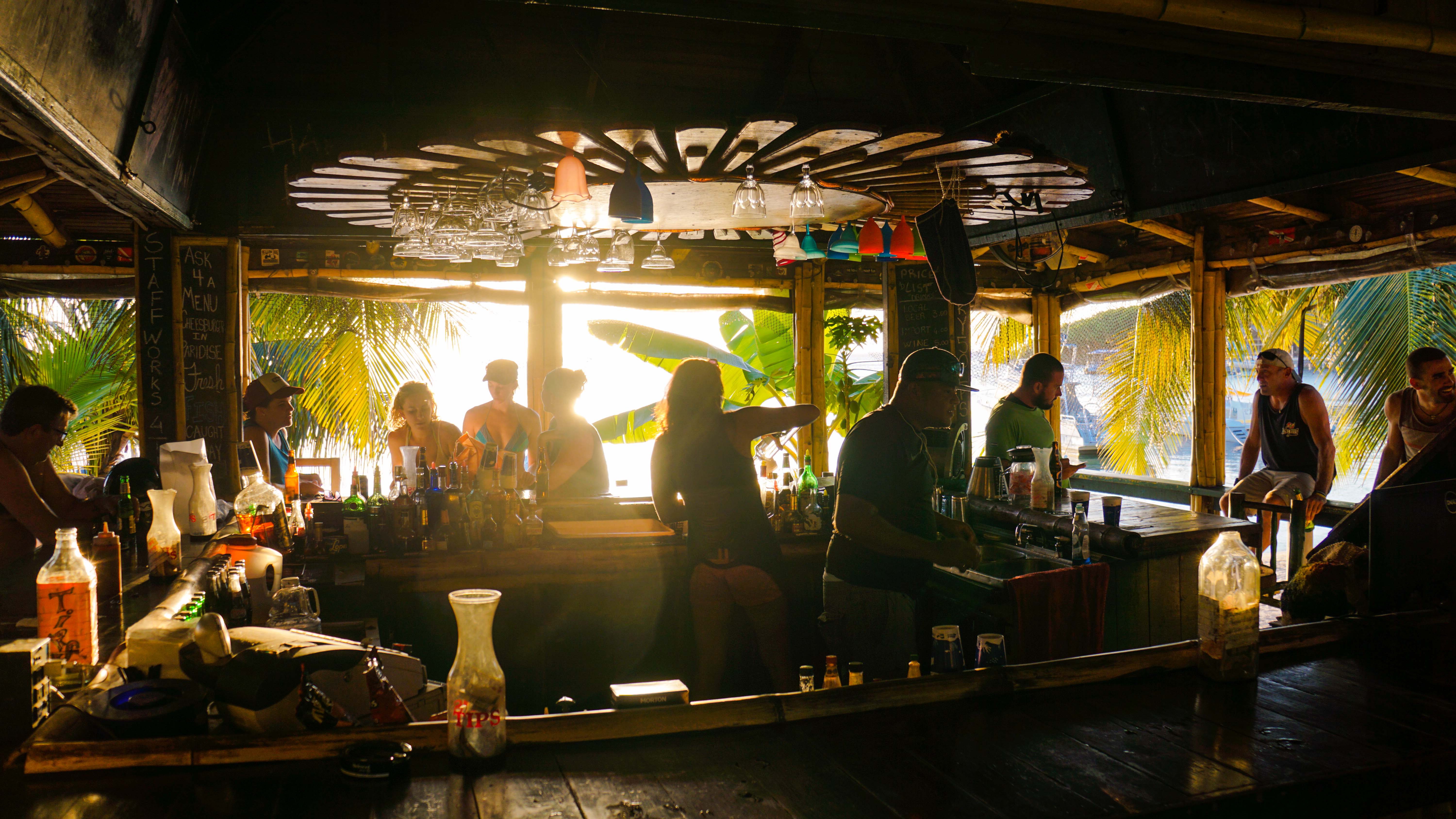 Neben dem Tauchen, meiner Hauptmotivation nach Roatan zu gehen, gibt es glücklicherweise nicht all zu viel zu tun. Der Rest der Insel besteht aus Dschungel und ein paar vereinzelten Dörfern, aber davon kriegen wir nichts mit. Wir sind viel zu beschäftigt diese Real-Life-Raffaelo-Werbung in vollen Zügen auszukosten. Am Strand liegend warten wir auf den täglichen Besuch von Milton, dem Banana-Donut-Mann. Nach dem Abendessen pilgern wir mit dem Rest der Meute für den Sonnenuntergang zur Strandbar „Sundowners“. Happy-Hour und Bob Marley, man kann schon verstehen warum für viele hier aus zwei Wochen Urlaub das restliche Leben wurde. Nach zwei Rum Punch überlegt man in eine eigene Strandbar zu investieren oder mit dem Banana-Donut-Mann einen Franchise-Deal einzugehen, nach zwei Weiteren schon wie lange der Überseecontainer braucht (4 Wochen) und in welcher Farbe man sein Holzhaus streicht (mintgrün). Unsere Hütte liegt glücklicherweise direkt gegenüber.